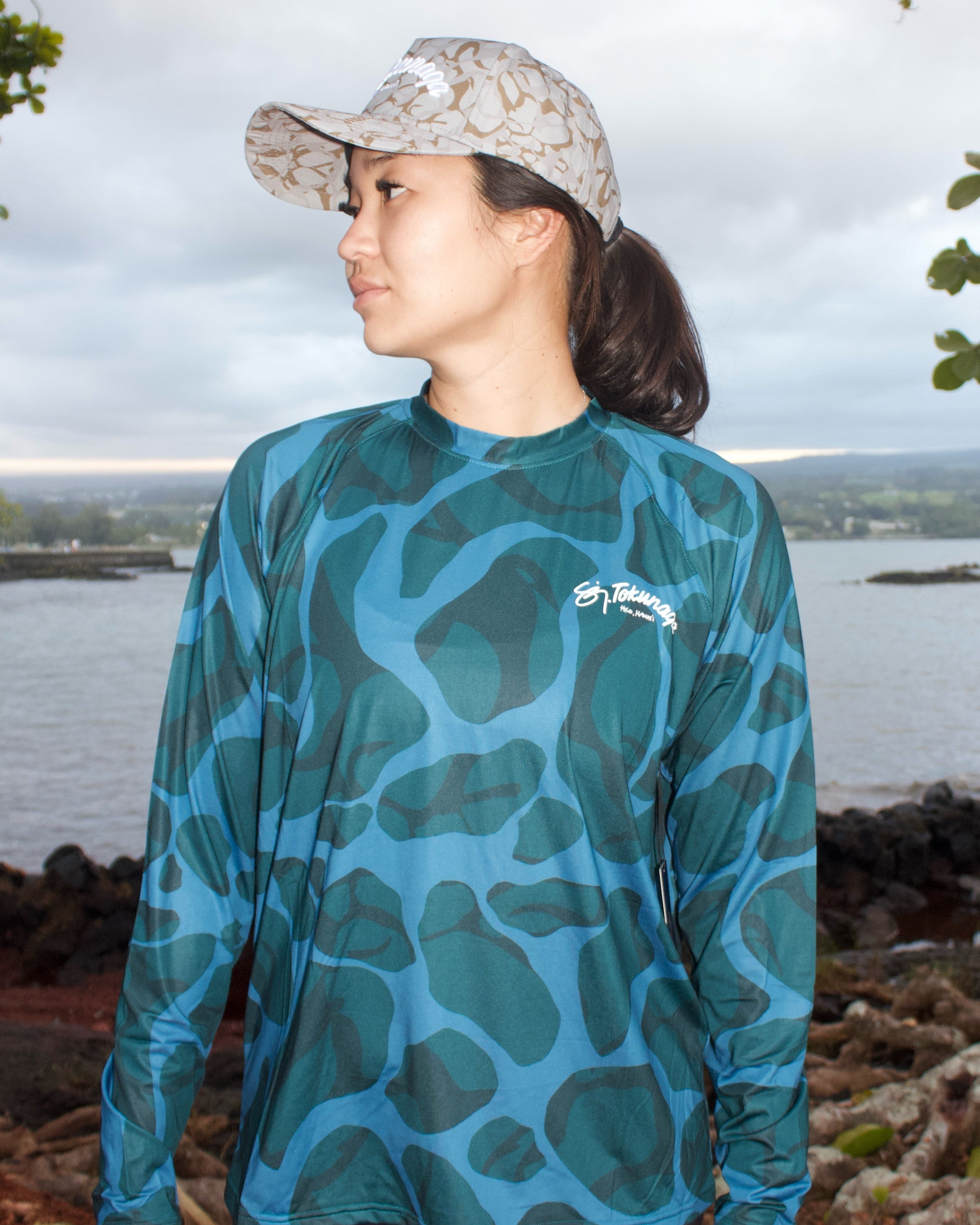 Our collaboration, S. Tokunaga + Sig Zane Designs, focuses on being out there, protected, and bringing home the goods. Going holoholo is about finding that spot and setting that hook! Our exclusive camouflage design is meant for you to dress the part! Hat, hooded jacket, UV shirt protection, and a comfortable chair - sets you up!