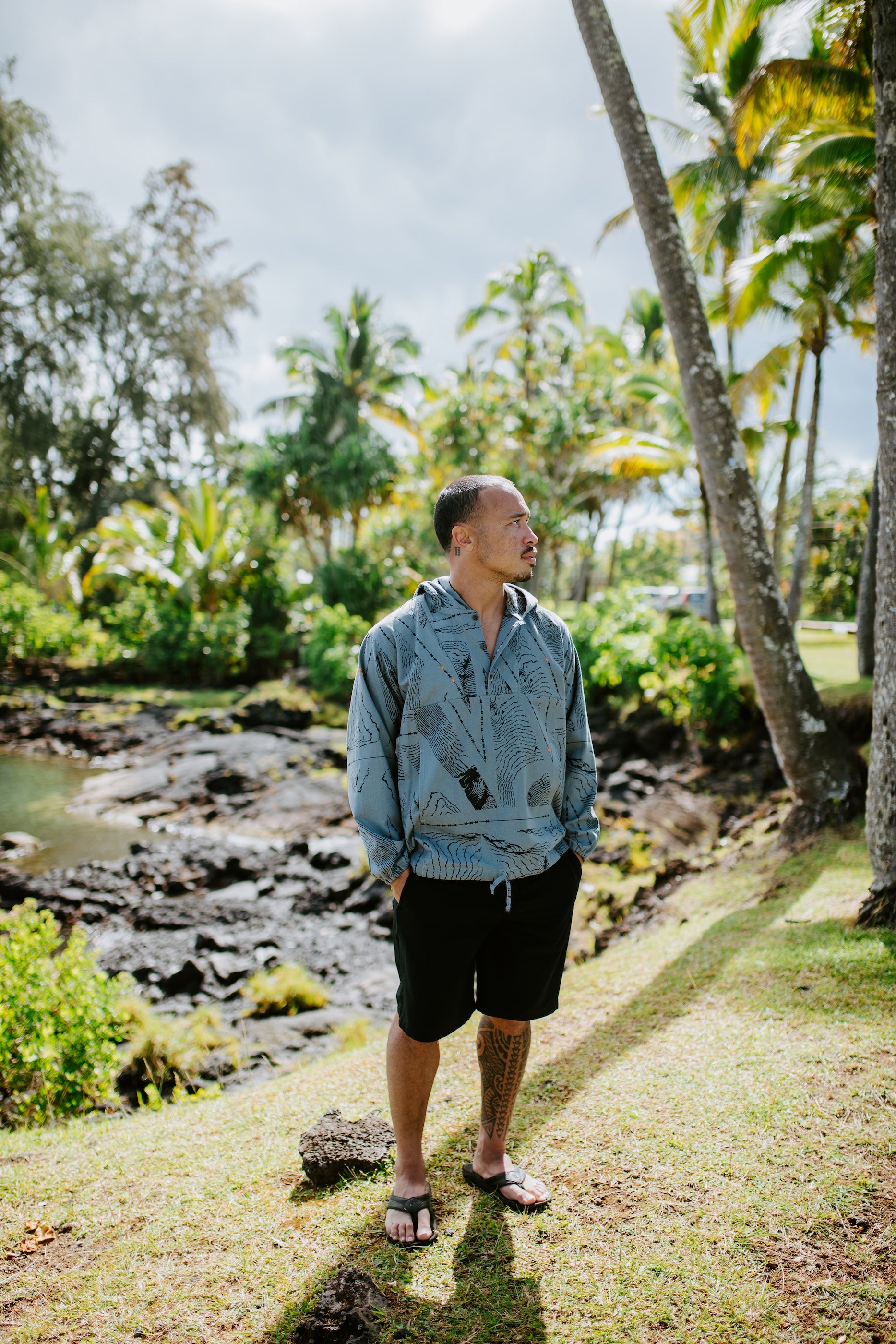 ʻAhuna is the term for a ti-leaf rain cape, coat, or garment. We give our anorak this name as it reminds us of the fisherwoman who accompanied Aunty Edith as she fished the shorelines fronting Keaukaha homesteads.