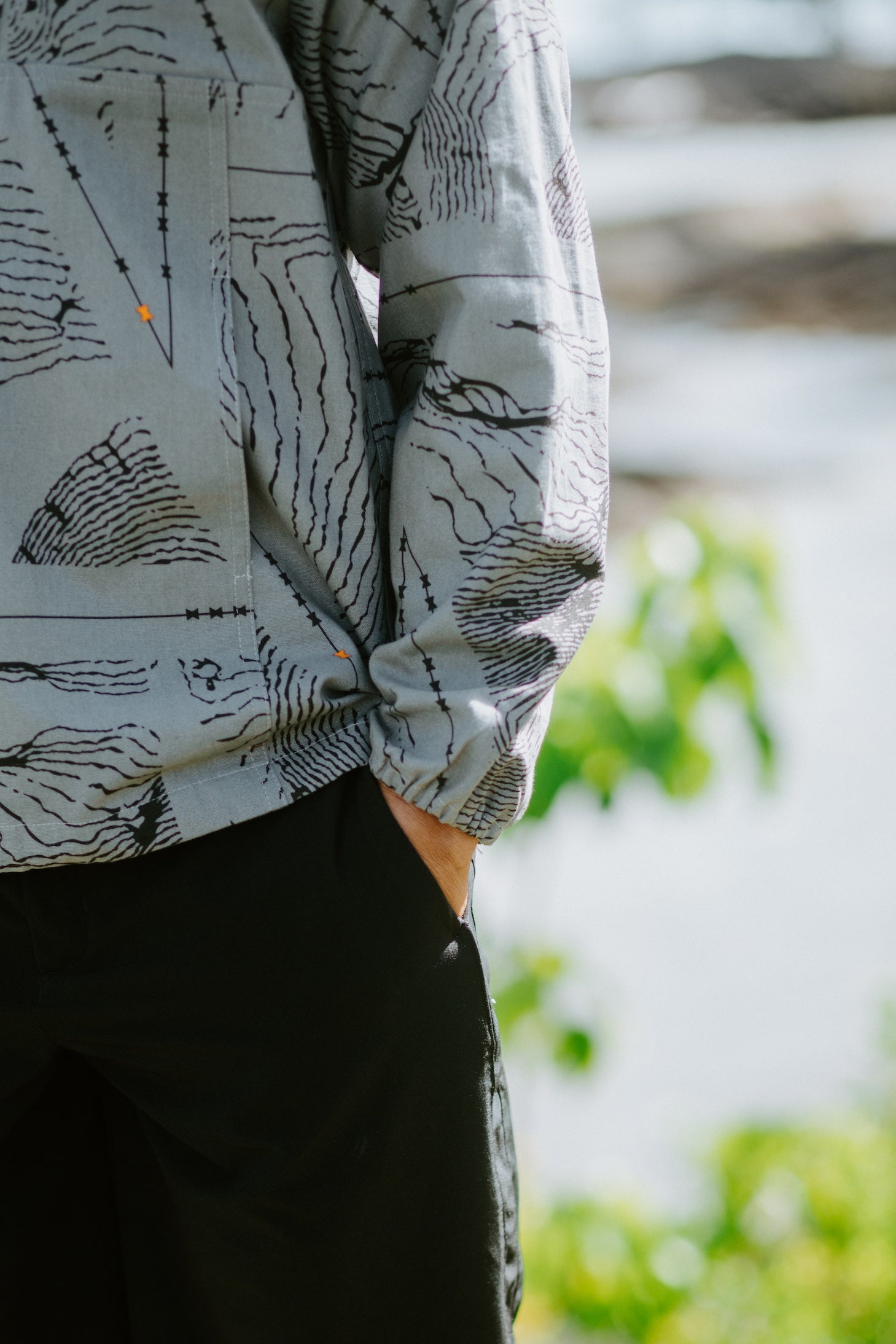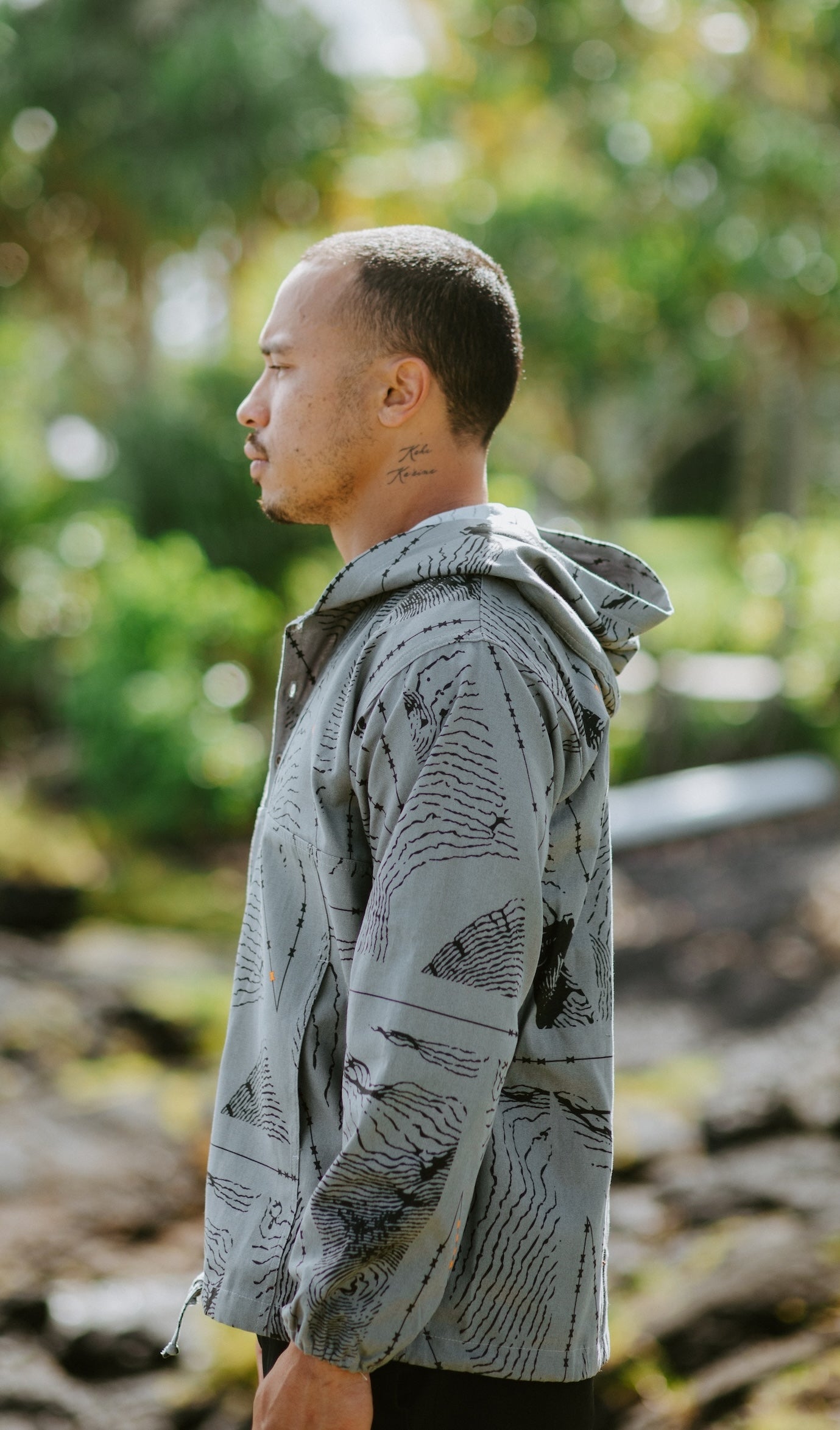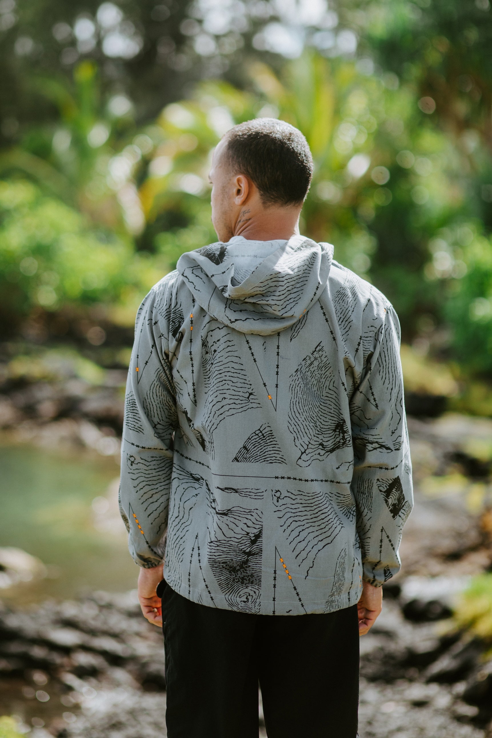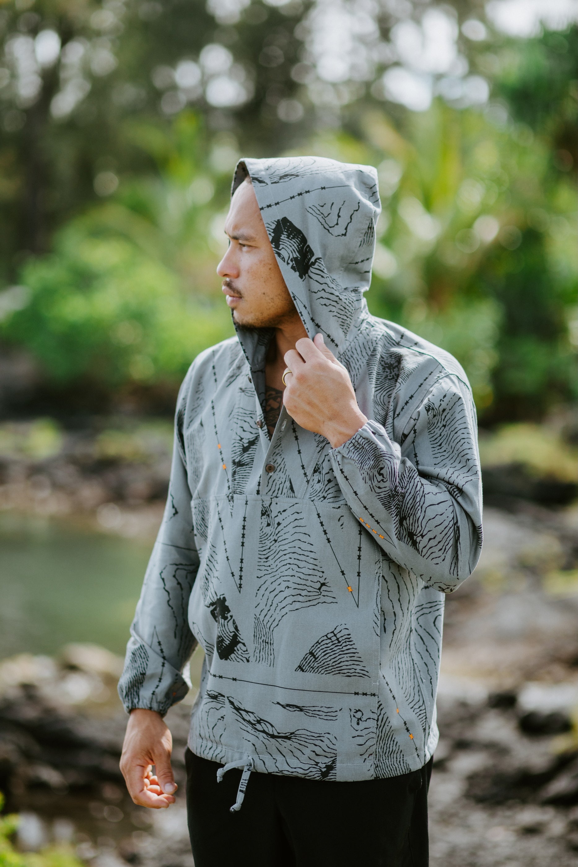 This Ahuna Anorak Jacket features our Healakūpono print on Smoke material with Black and Torch ink.