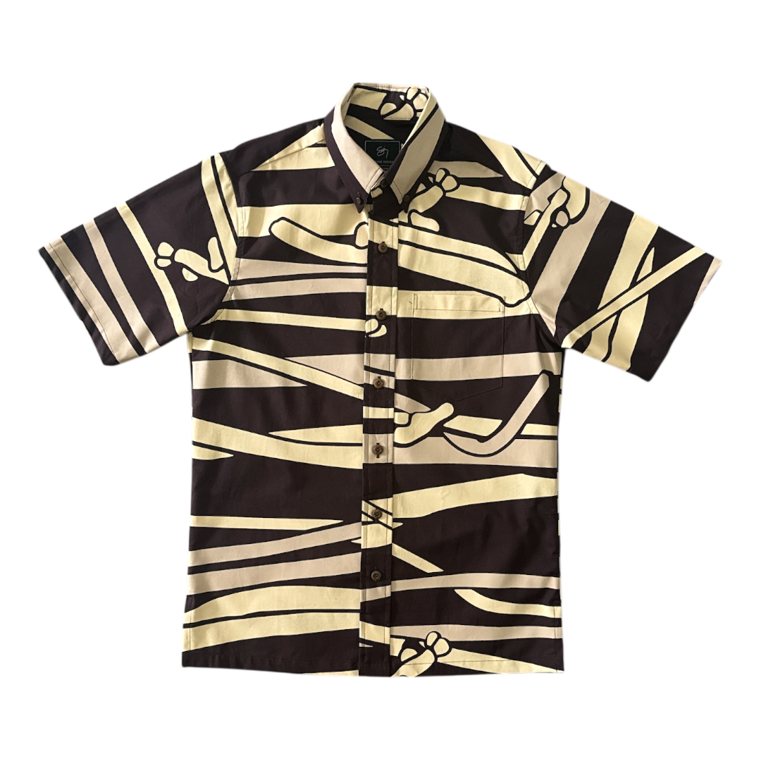 This button up aloha shirt features our Kaunaʻoa Pehu print on Espresso material with Champagne and Raffia ink.