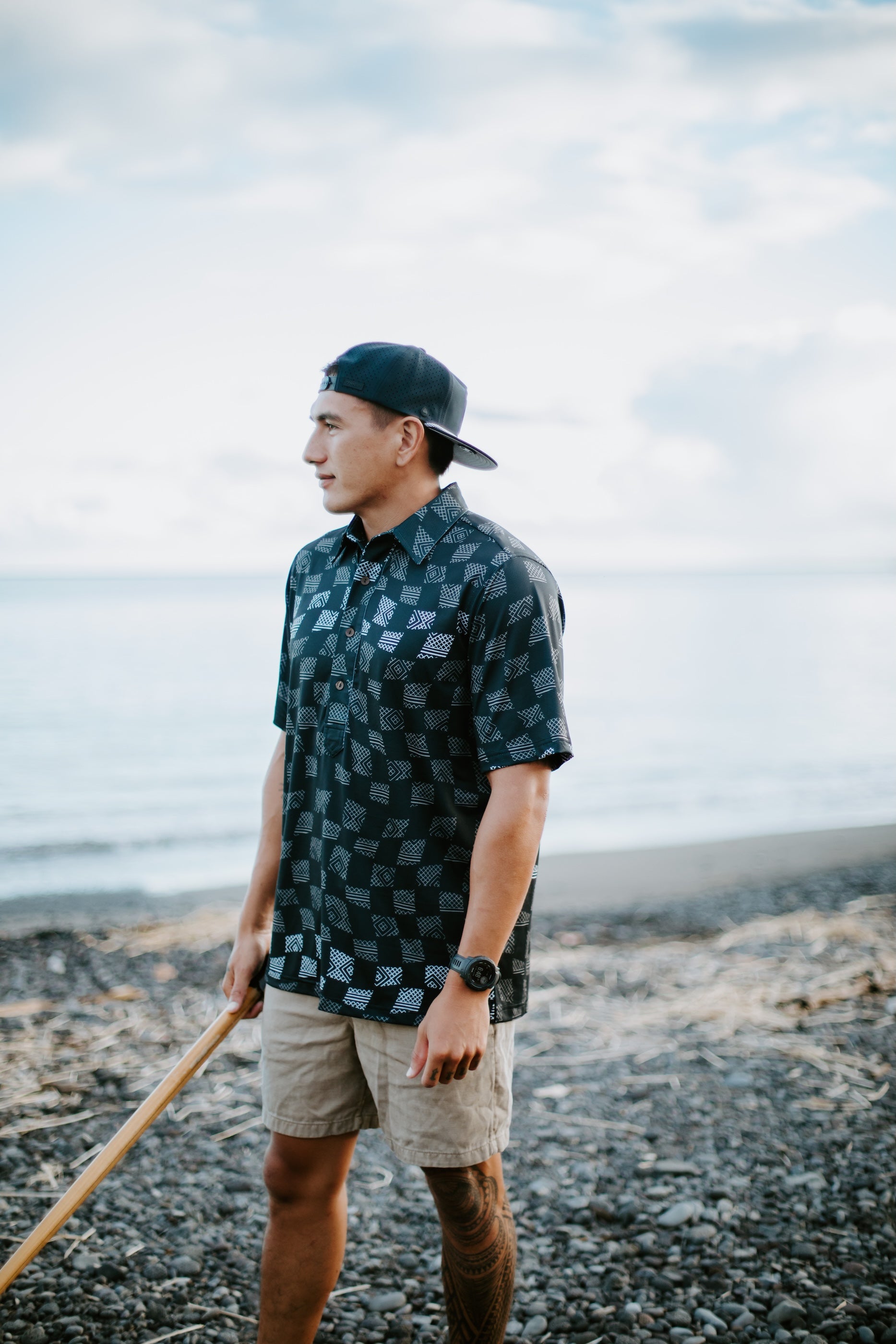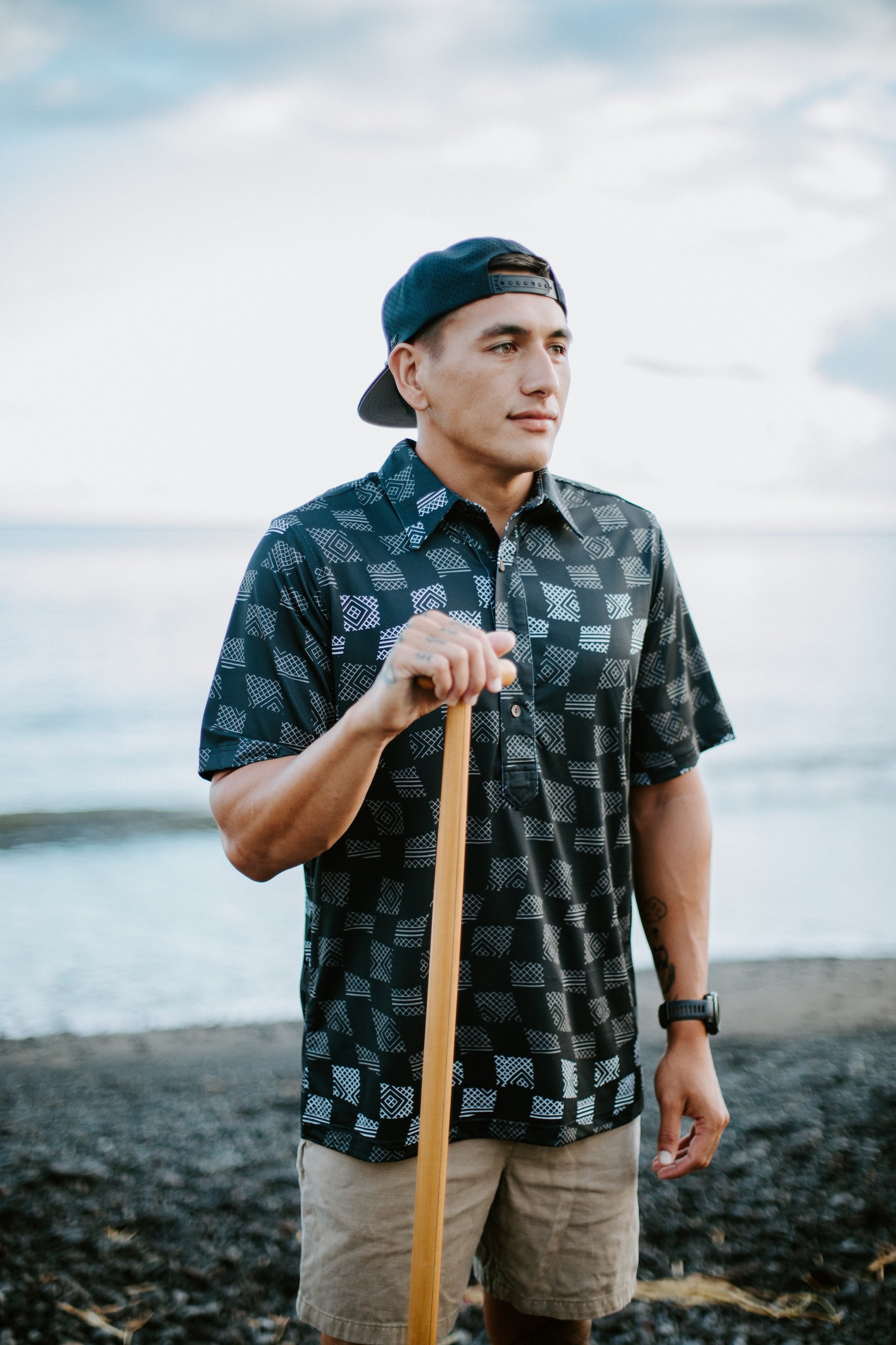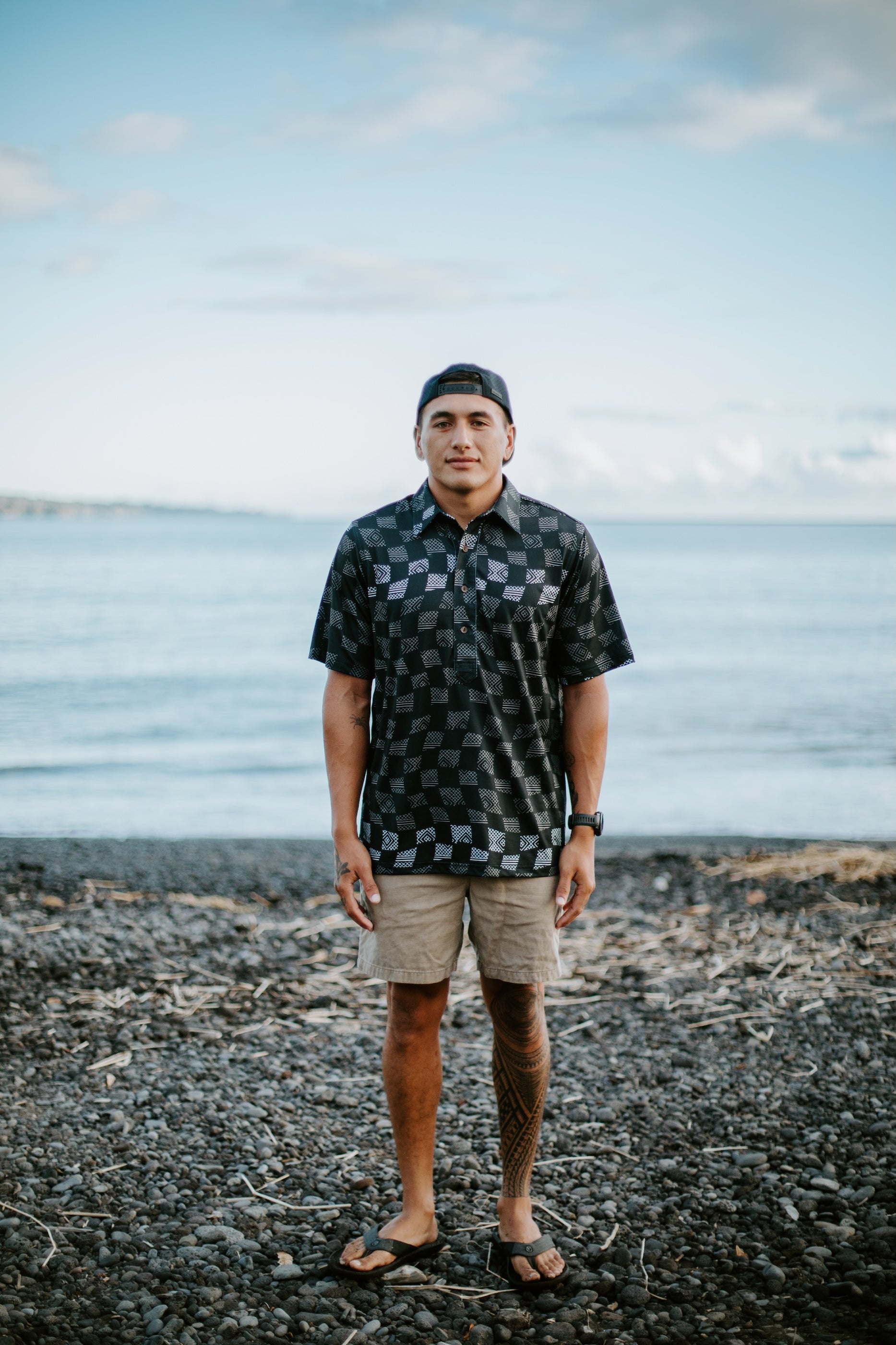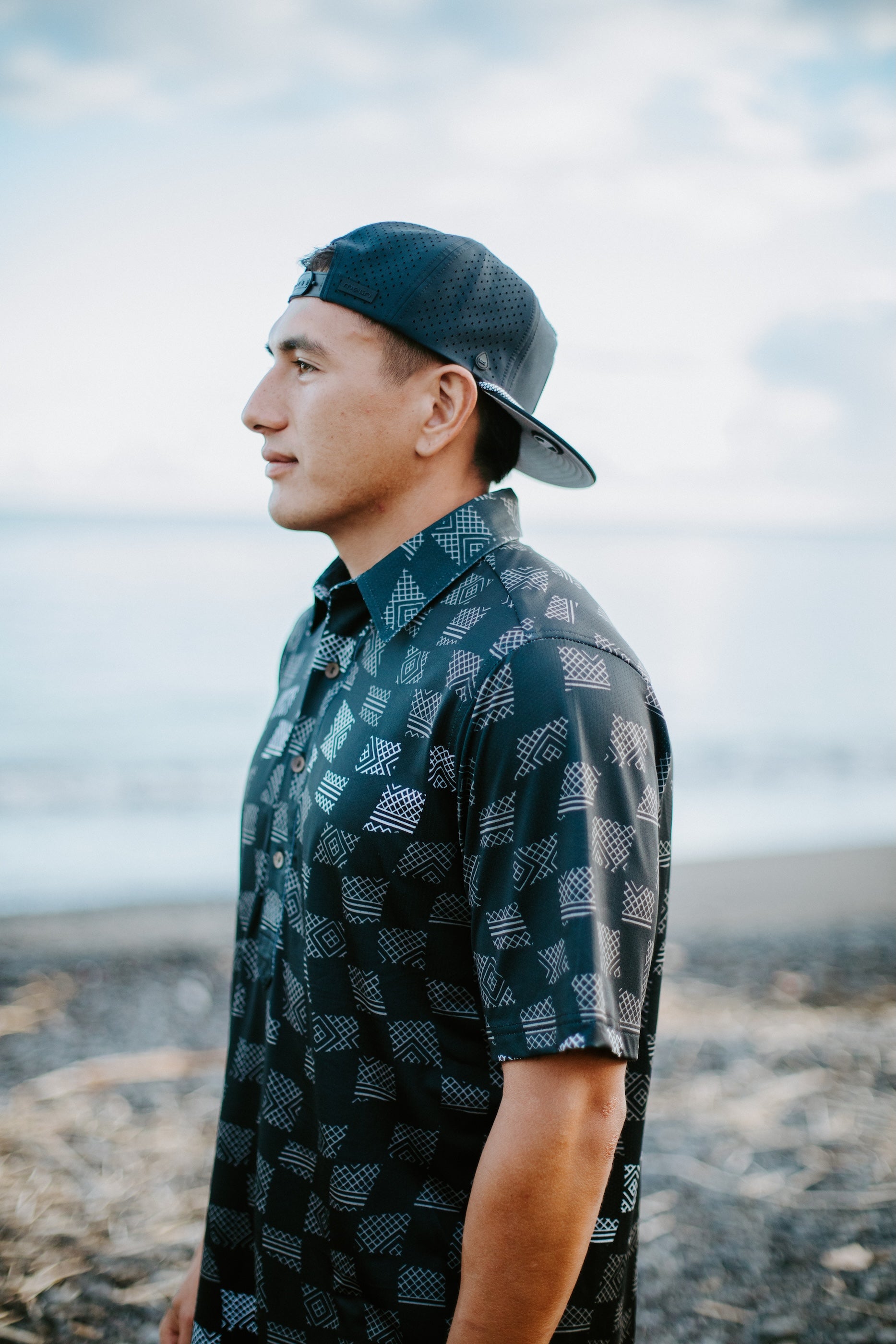 This Yuen Aloha shirt features our Kīholo print on Black material with Grizzly and White Ink.