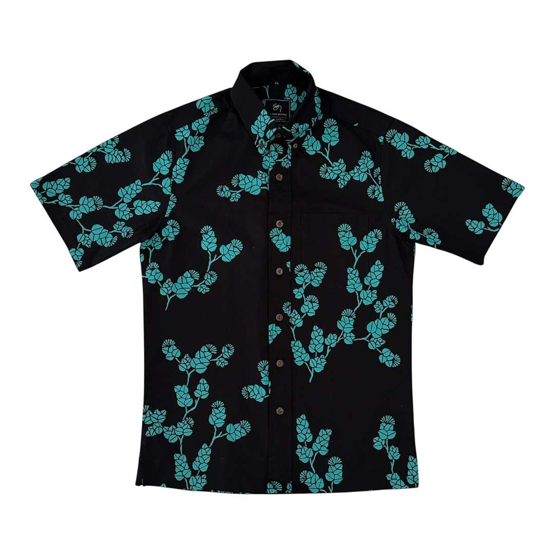 This Button Up aloha shirt features our Liko Lehua print on Black material with Jade Green ink.