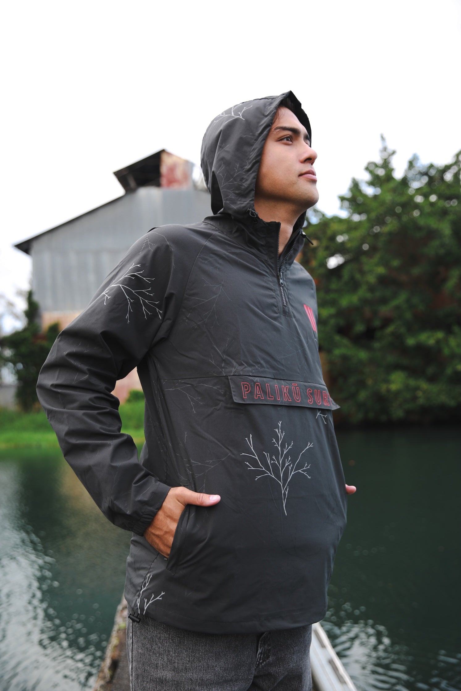 This anorak windbreaker features our Manamana Manauea print on Black material with Charcoal and Pimento ink.