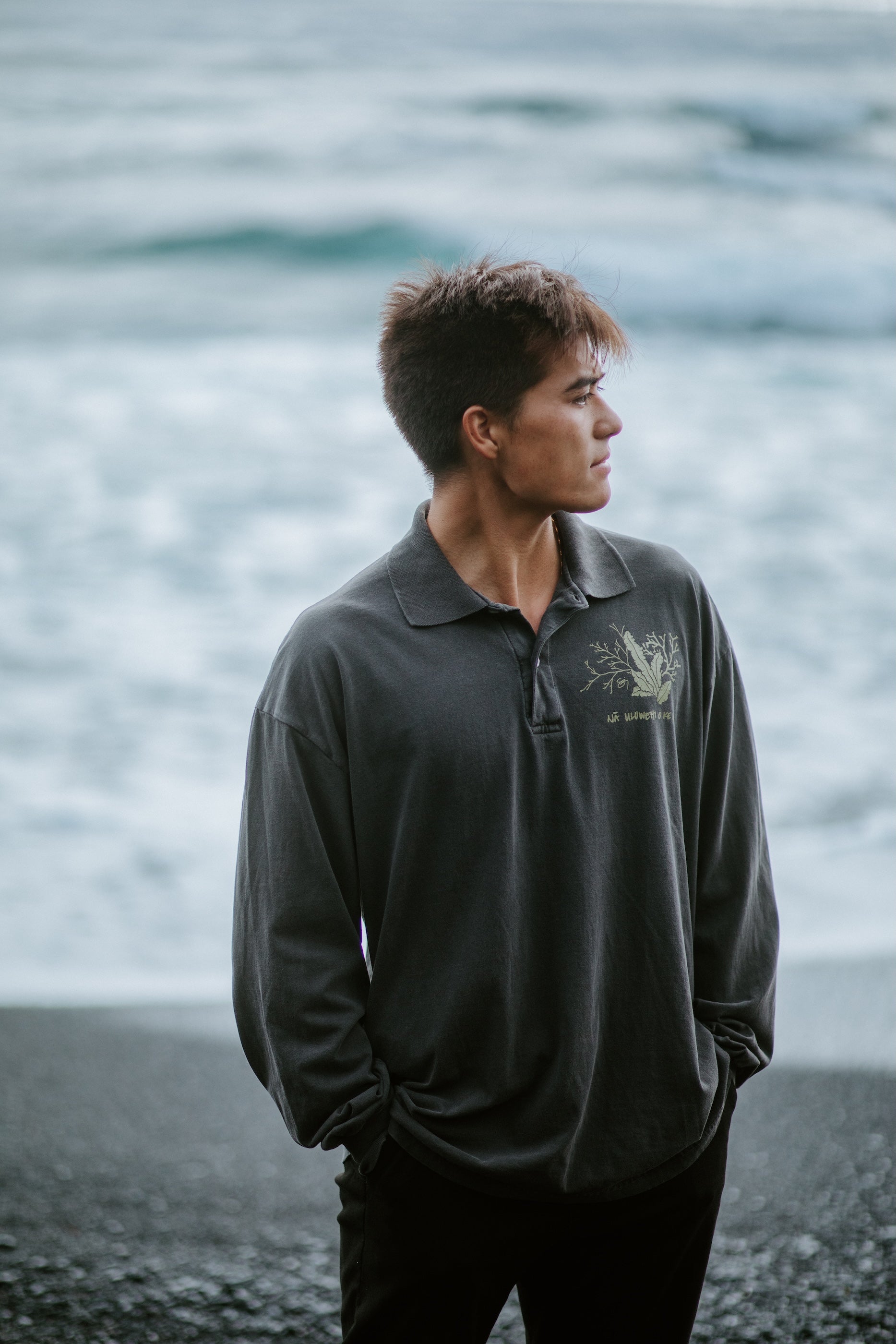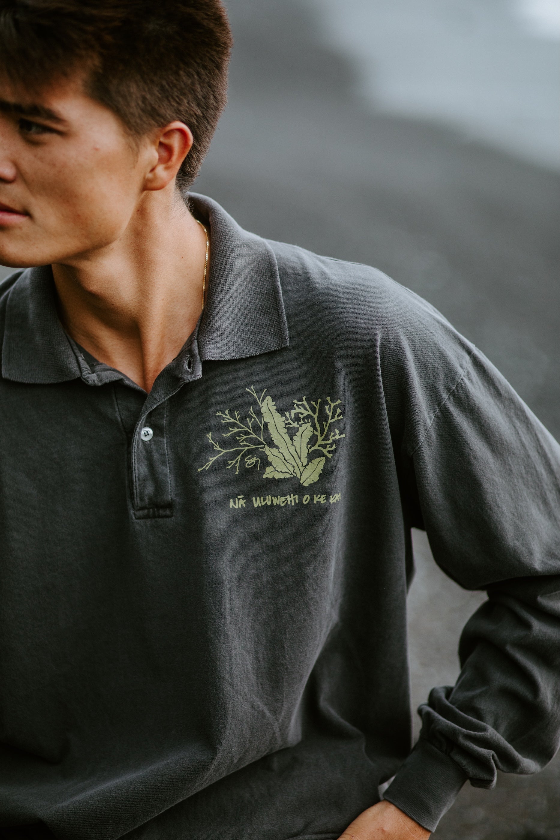 Nā Uluwehi O Ke Kai Longsleeve Polo Shirt- Vintage Black