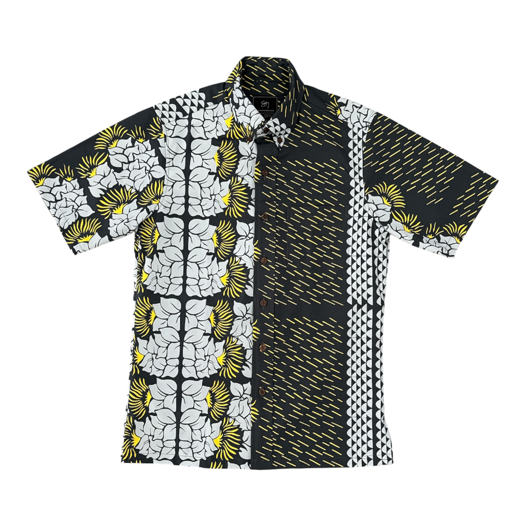 This button up aloha shirt features our Ola Kanilehua print on Gotham Grey material with Lighthouse and Citrus ink.