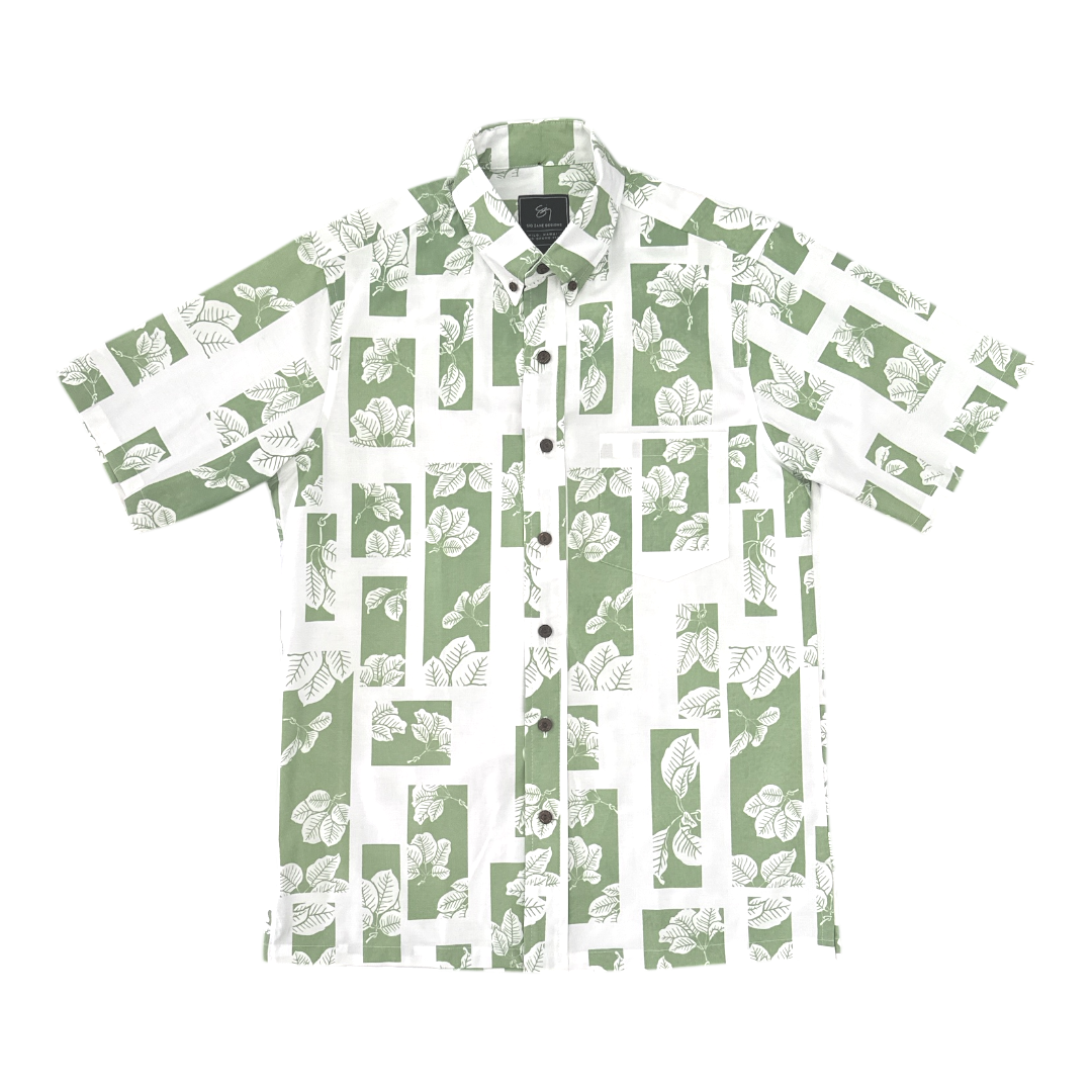 This Button up features our ʻŌlapalapa print on White material with Celadon ink.