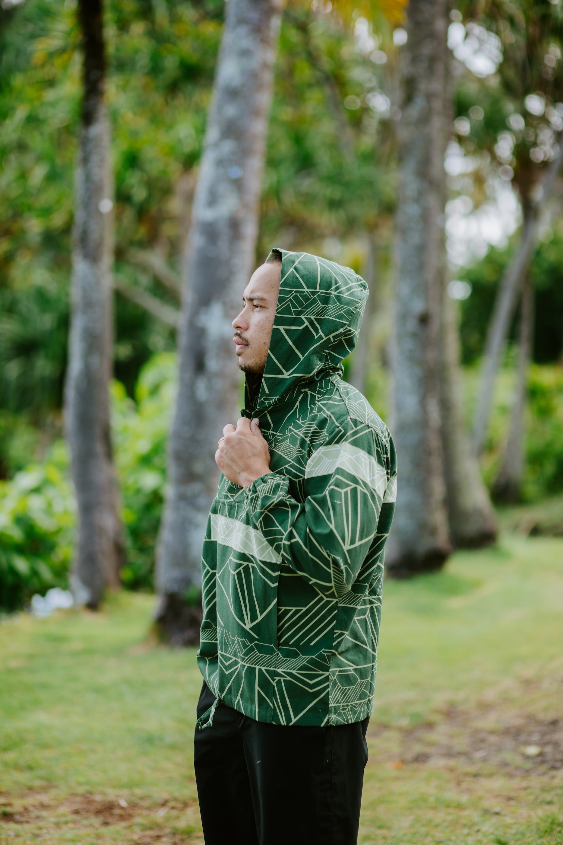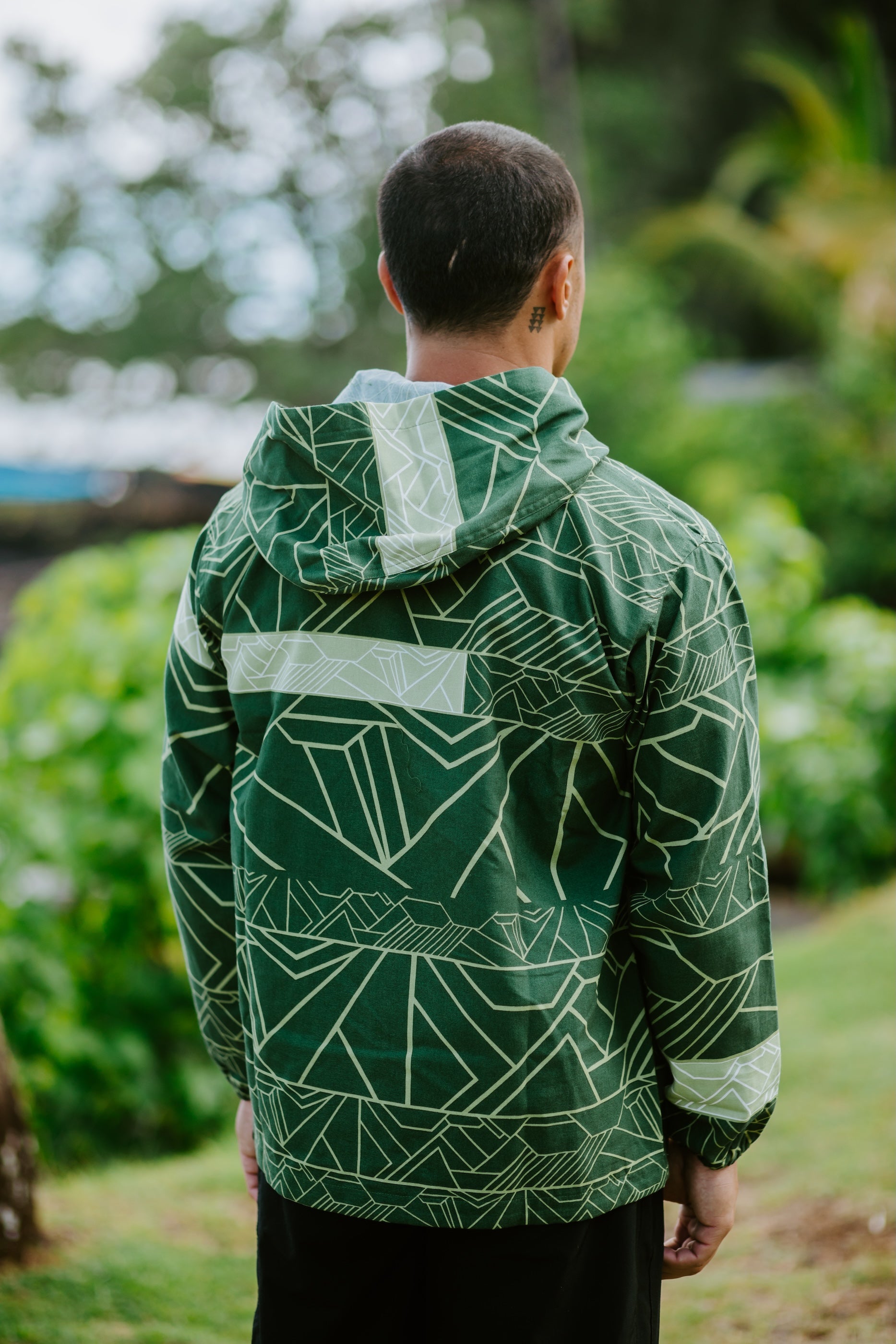 This Ahuna Anorak Jacket features our Puʻumanawaleʻa print on Moss material with Sweet Pea and Limestone ink.