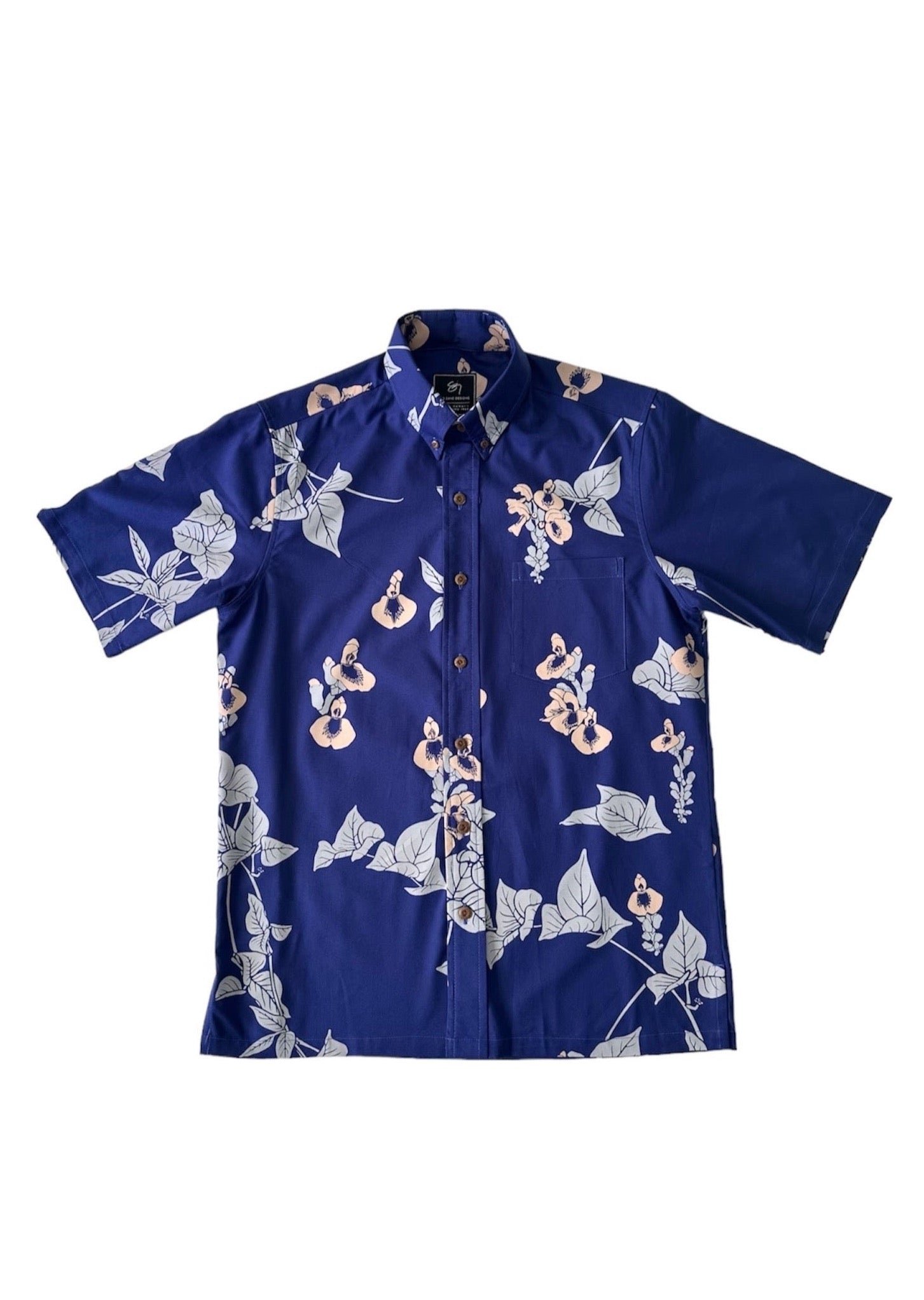 This button up aloha shirt features our Puakānekauila print on Nightfall material with Iron and Cobblestone ink.