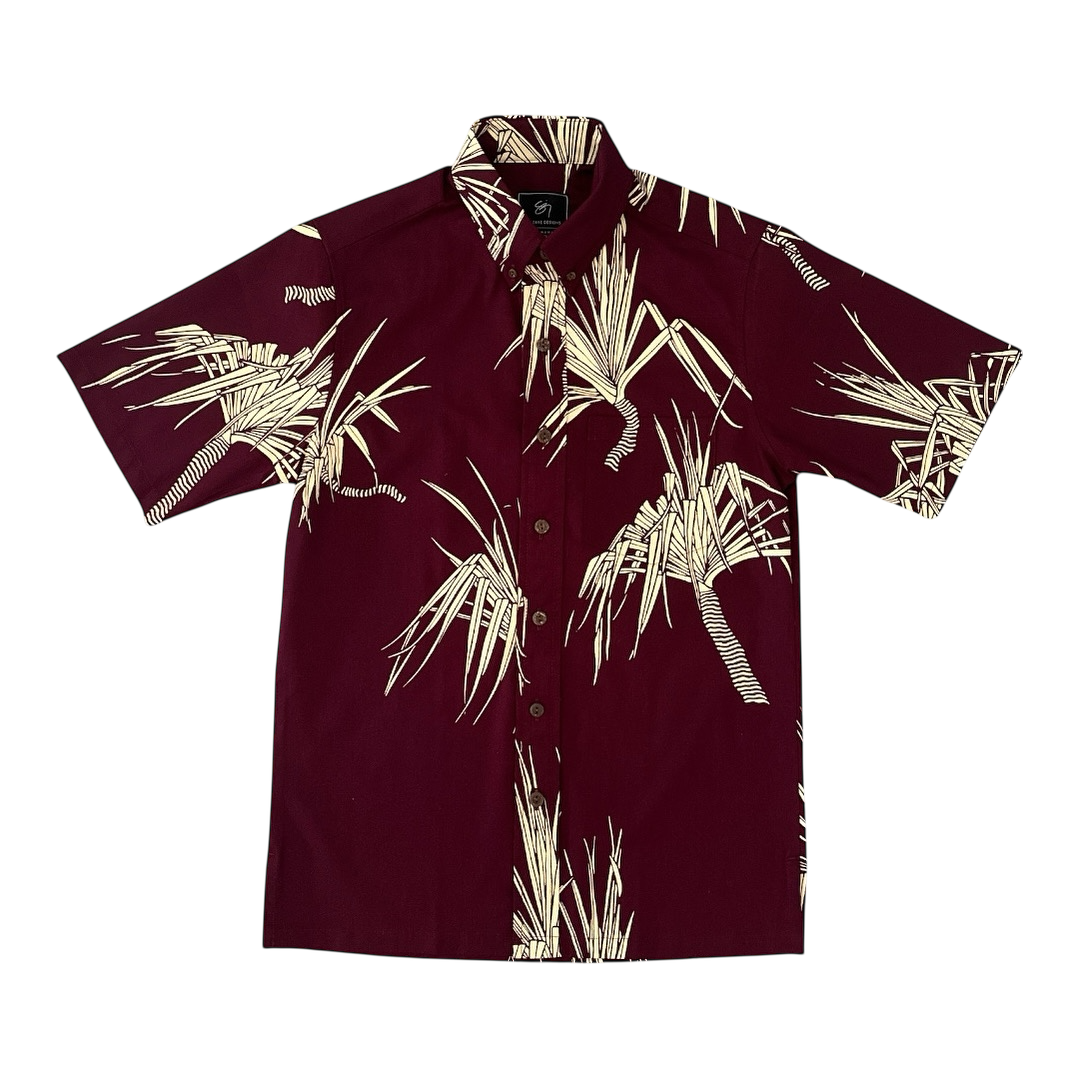 This button up aloha shirt features our Pūhala print on Burgundy material with Champagne ink.