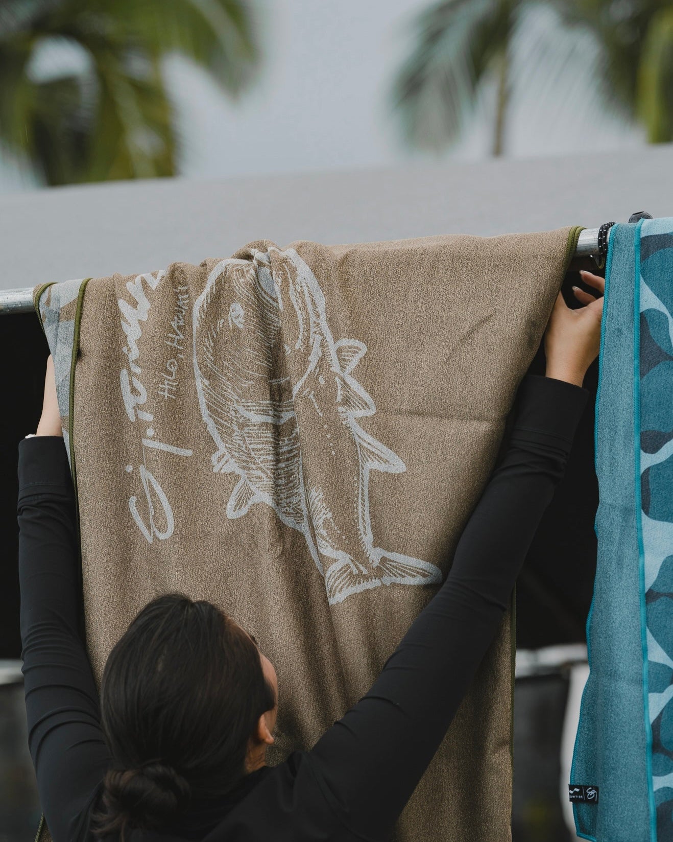 This Slowtide quick dry towel features our Hanapaʻa print on green material.