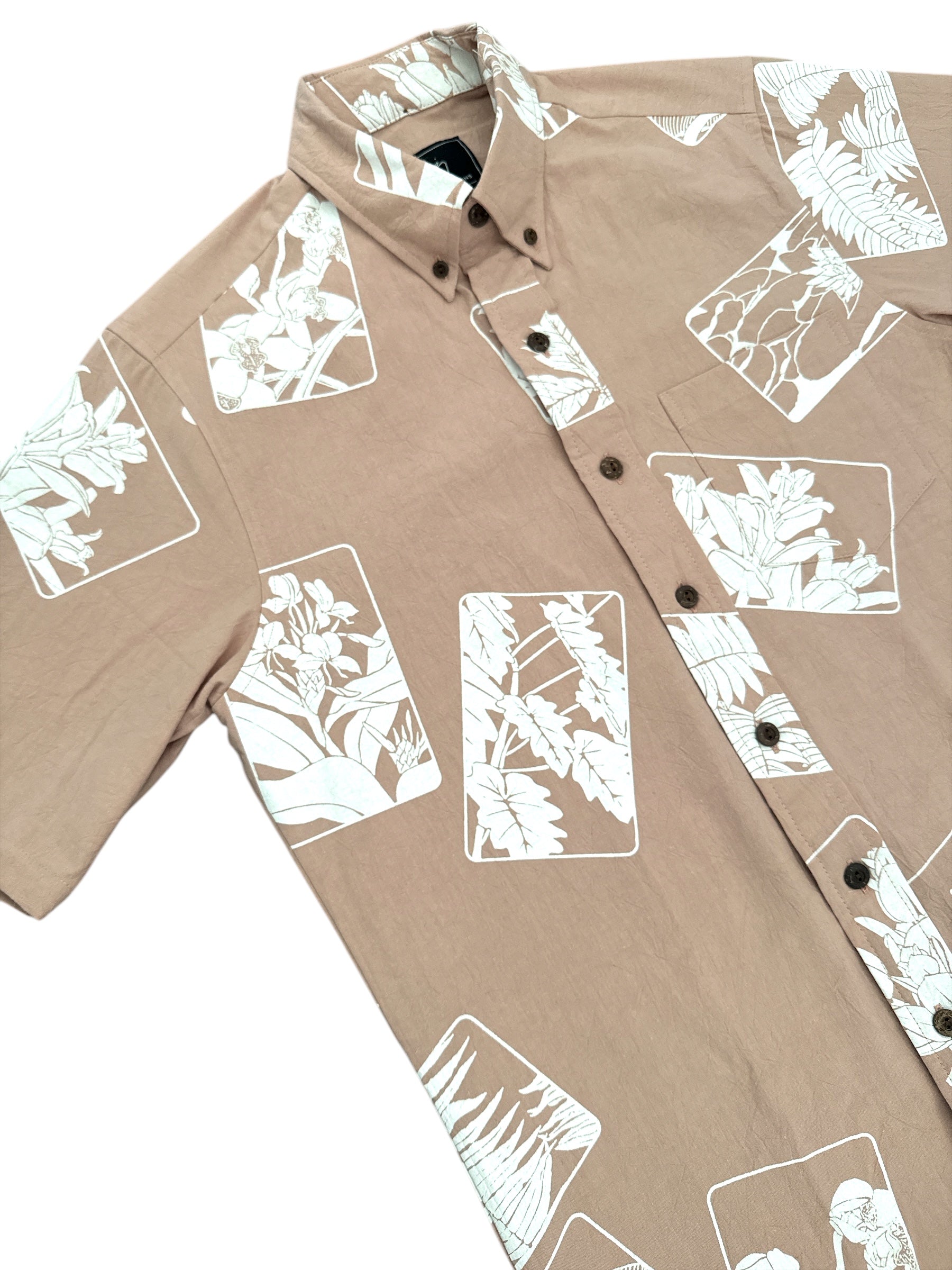 This button up aloha shirt features our Tropical Postcards print on Gray Pink material with White ink.